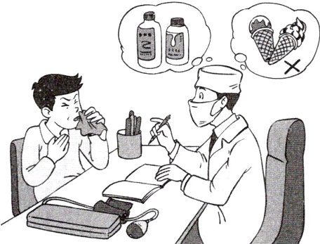 A: You should ____________ some medicine and drink ____________ warm water. You ____________ eat ice creams.
