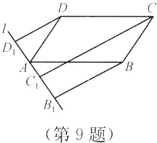 9. 如图,直线l过▱ABCD的顶点A,点$D_{1}$、$C_{1}$、$B_{1}$都在直线l上,且$DD_{1}$//$CC_{1}$//$BB_{1}$. 求证:$CC_{1}$ = $DD_{1}$ + $BB_{1}$.