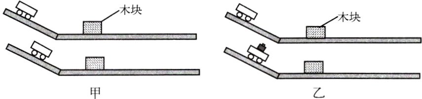 A. 让同一辆小车分别从同一斜面的不同高度由静止开始下滑,与放在水平面上的木块相碰,比较木块在水平面上移动的距离(如图甲所示);