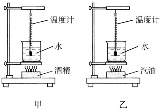 4. 有如图所示的两套相同装置,分别在两个燃烧皿中放入质量________(选填“相同”或“不同”)的不同燃料,点燃后加热________(选填“质量”或“体积”)相等的同种液体,通过比较燃料________________(选填“燃烧相同时间”或“全部燃烧”)后温度计示数的变化,来判断两种燃料的热值的大小. 燃料燃烧时将_______能转化为内能,用比热容________(选填“大”或“小”)的液体可以使实验现象更明显.(实验中液体没有沸腾)