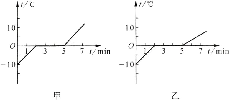 3. 如图所示,设相同时间内物质吸收的热量相同,甲、乙两图中符合冰熔化规律的是图________(选填“甲”或“乙”). 这是因为$c_{冰}$________(选填“>”“<”或“=”)$c_{水}$,所以相同时间内________(选填“冰”或“水”)升温更快.