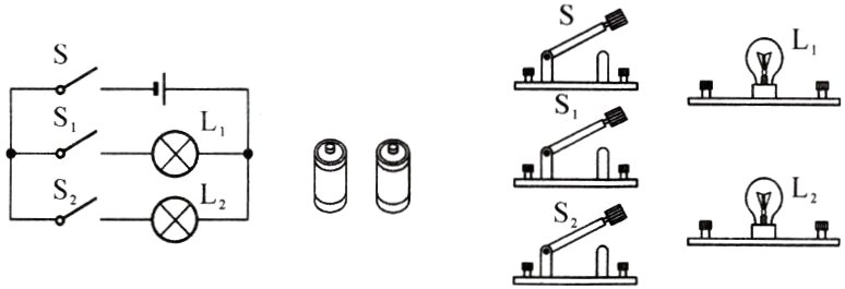 5. 如图所示电路中,当开关________闭合时,L₁、L₂串联;当______闭合时,L₁、L₂并联;当____________闭合时,电路会发生短路,损坏电源。