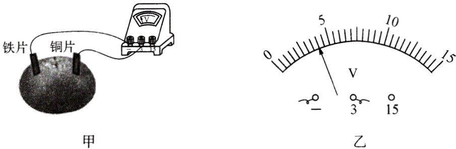 5. 取一个橙子,把铜片、锌片插入其中,就制成了一个水果电池,并利用电压表直接测量两极板间的电压。如图甲所示,发现电压表指针正常偏转(右偏),则说明铜片是________极;电压表读数放大如图乙,则铜、铁两极间电压为________V;水果电池将________能转化为________能。