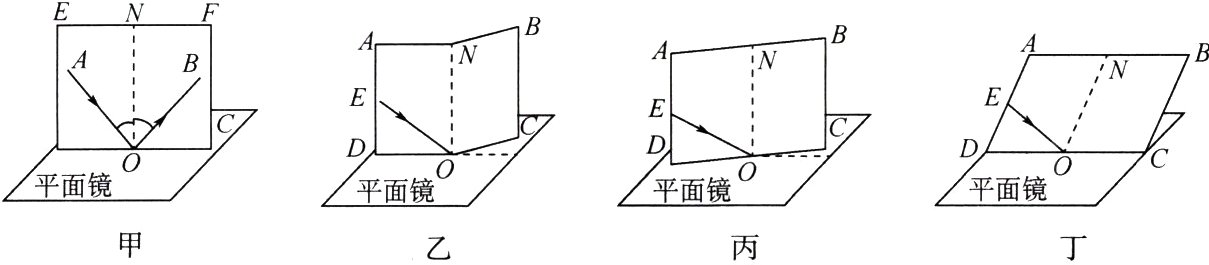 9. 如图所示,探究光的反射规律时,在水平放置的平面镜上方竖直放一光屏,光屏由可以绕ON折转的E、F两块白板组成,如图甲所示。
