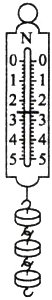 9. 用如图所示的弹簧测力计测钩码的重力,首先观察弹簧测力计的测量范围是_______ N,最小分度值是_______ N. 测力时,使测力计内的弹簧伸长方向与_______方向在一直线上,再读出指针所指的示数为_______ N.