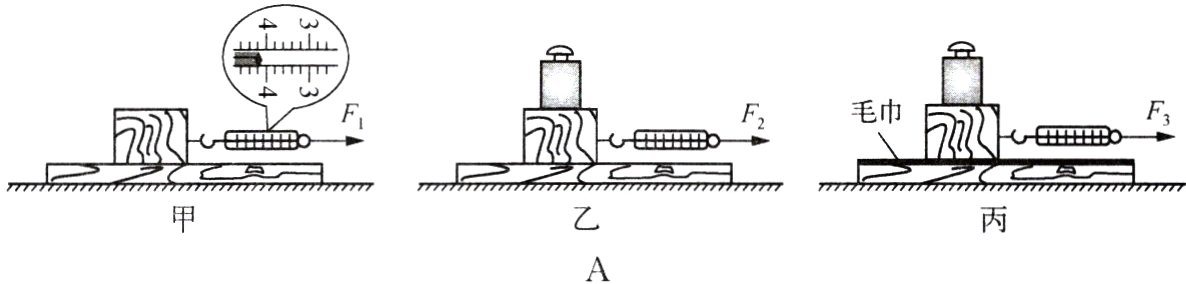 9. 在“探究影响滑动摩擦力大小因素”实验中,水平桌面上的器材有:弹簧测力计、木块、钩码、木板和毛巾,实验装置如图A所示。