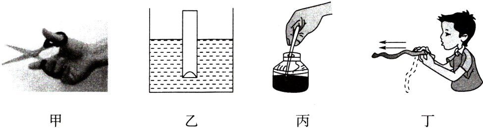 D. 图丁中,从纸条上方沿纸条吹气,此时纸条上方的气压大于下方的气压