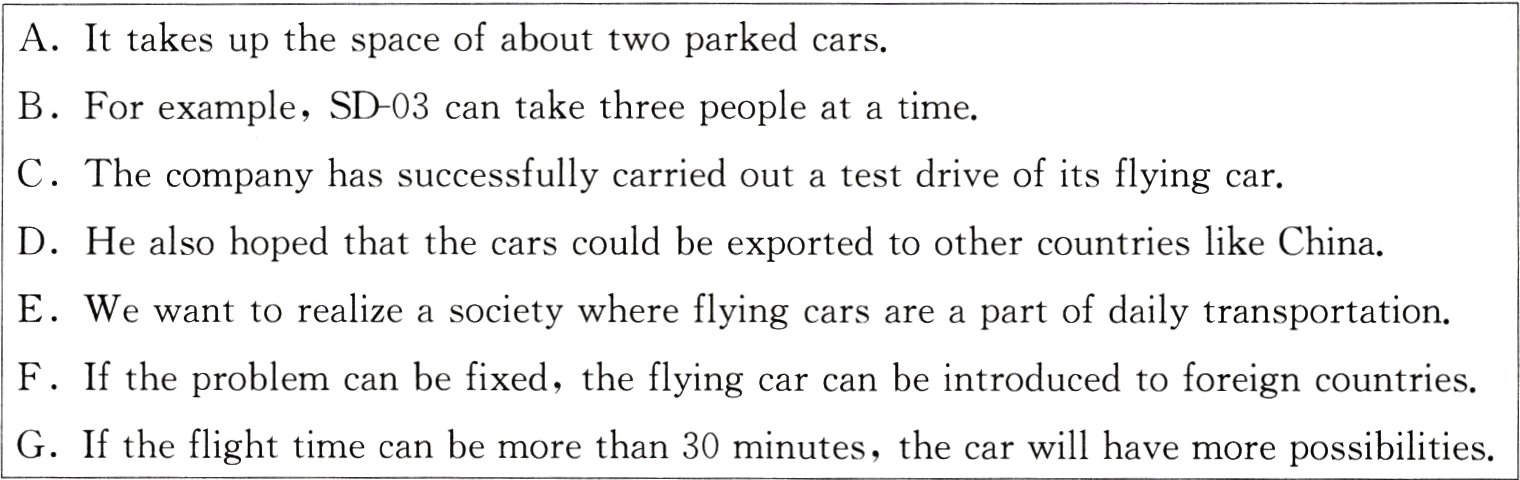 So far, the machine can fly for just 5 to 10 minutes. _43_ Tomohiro Fukuzawa, CEO of SkyDrive, hoped the flying car would be put into public use by 2023. _44_