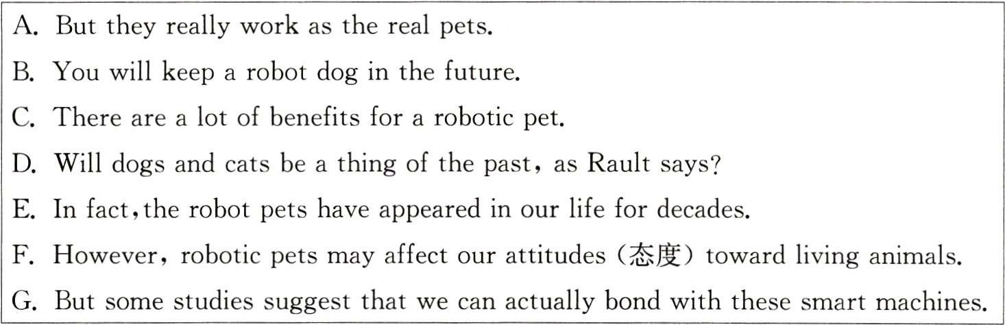 F. However, robotic pets may affect our attitudes (态度) toward living animals.