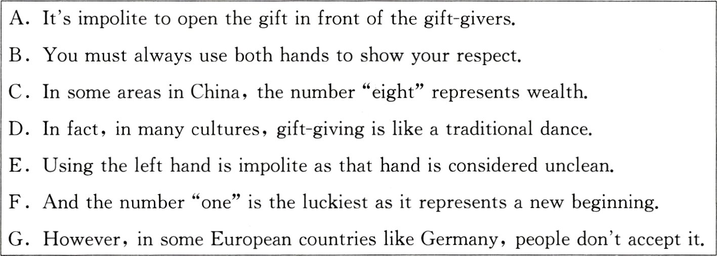D. In fact,in many cultures,gift-giving is like a traditional dance.