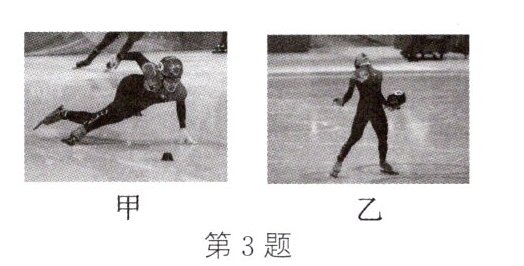 3. 在2022年北京冬奥会短道速滑男子1000 m比赛中,中国选手获得金牌,图甲是他正全力通过弯道,图乙是他获胜后站立在水平赛场中央大声欢呼的情形。下列说法正确的是( )