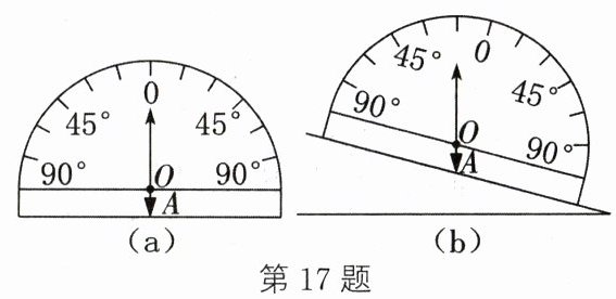17. 小明用刚学的知识做了一个坡度自动测量仪,如图(a)所示,图中的指针和铅锤A会绕O点转动,若放在斜坡上,如图(b)所示,则此斜坡坡度为_______°,此装置的原理是利用_______,若用此装置测量竖直墙壁,则指针应指在_______°位置。