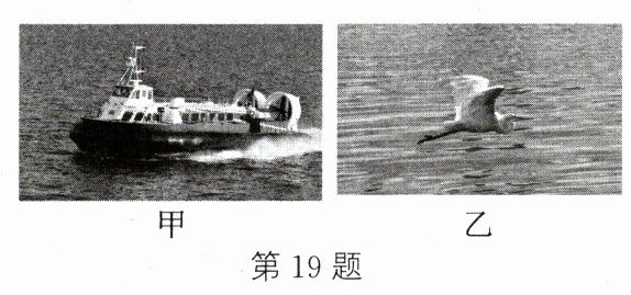19. 图甲中,气垫船通过气垫系统向船体下方喷射高压气体,形成气垫悬浮,从而减小阻力,其他具有类似的减小阻力方式的交通工具_______(写一条即可);结合图乙,从仿生学角度再给出一条有利于交通工具行驶过程中减小阻力的建议:_______。