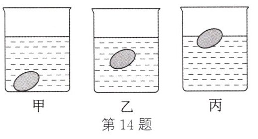 14. (2024·连云港二模)取甲、乙、丙三个相同的烧杯盛有不同浓度的盐水放在水平面上,将鸡蛋先后放入其中,同一个鸡蛋在三杯液体中呈现出如图所示的状态,放入鸡蛋后液面相平,则下列物理量间的关系正确的是 ( )