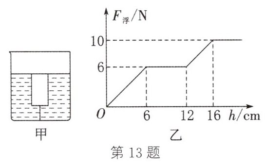 13. (2024·淮安涟水一模)将一圆柱形木块用细线拴在容器底部,容器中开始没有水,往容器中逐渐加水至如图甲所示位置,在这一过程中,木块受到的浮力随容器中水的深度的变化如图乙所示,则由图像得出的以下信息正确的是(g取10N/kg) ( )