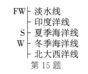 15. (2024·呼和浩特新城校级期末)为了航行安全,远洋轮的船体需标有国际航行载重线,即轮船满载时的“吃水线”。如图所示是某船满载时在不同水域、季节时的“吃水线”,该船在不同水域、季节航行时,水(海水)面正好与“吃水线”相平,当船从北大西洋驶向印度洋时(忽略燃料质量变化),下列分析正确的是 ( )