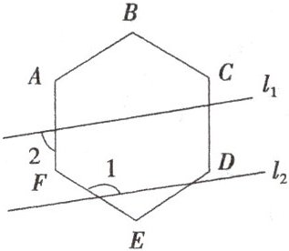 18. 如图,$ l _ { 1 } $ 与 $ l _ { 2 } $ 穿过正六边形 $ A B C D E F $,且 $ l _ { 1 } // l _ { 2 } $,则 $ ∠ 1 - ∠ 2 $ 的度数为______.