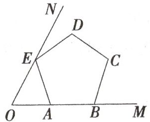 14. 如图所示,已知 $ ∠ M O N = 60 ^ { \circ } $,正五边形 $ A B C D E $ 的顶点 $ A $、$ B $ 在射线 $ O M $ 上,顶点 $ E $ 在射线 $ O N $ 上,则 $ ∠ A E O = $______度.