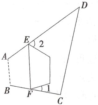 13. 如图,$ E $,$ F $ 分别是四边形 $ A B C D $ 的边 $ A D $,$ B C $ 上的点. 连接 $ E F $,将四边形 $ A B C D $ 沿直线 $ E F $ 折叠. 若点 $ A $,$ B $ 都落在四边形 $ A B C D $ 的内部,记 $ ∠ C + ∠ D = \alpha $,则 $ ∠ 1 + ∠ 2 = $______.