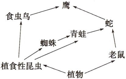 (2)食物链的起点是生产者,终点是消费者,在该生态系统中草是生产者,而鼠、植食性昆虫、食虫鸟、蜘蛛、青蛙、蛇、鹰是动物属于消费者,所以图中共有 4 条食物链:①植物→植食性昆虫→食虫鸟→鹰;②植物→植食性昆虫→蜘蛛→青蛙→蛇→鹰;③植物→植食性昆虫→青蛙→蛇→鹰;④植物→老鼠→蛇→鹰。因此最长的一条食物链是植物→植食性昆虫→蜘蛛→青蛙→蛇→鹰。