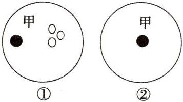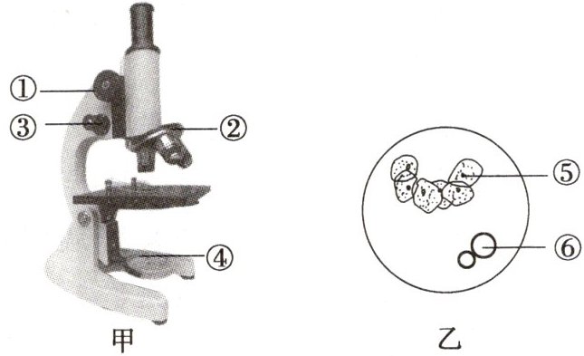 【解析】⑥是气泡,因为气泡一般边缘较黑、较宽,形状呈圆形或椭圆形,中心往往是一片空白,A正确;当光线强时,视野过亮,用反光镜的平面镜,遮光器的小光圈;光线弱时,视野较暗,用反光镜的凹面镜,遮光器的大光圈,所以若观察的视野较暗,可调节图甲中的④反光镜,使用反光镜的凹面镜,B正确;由于显微镜下成的像是倒立的像(相当于将物体水平旋转$180^{\circ }$后的图像),所以物像移动的方向与玻片标本移动的方向是相反的。可以理解为:若将物像移至视野中央,则物像位于哪一方,玻片标本就移向哪一方,图乙中的⑤位于视野上方,若将图乙中的⑤移至视野正中央,应向上方移动装片,C错误;③细准焦螺旋能较小幅度的升降镜外,还能使焦距更精确,使看到的物像更清晰,所以低倍镜下要使物像更加清晰,应调节图甲中的③细准焦螺旋,D正确。