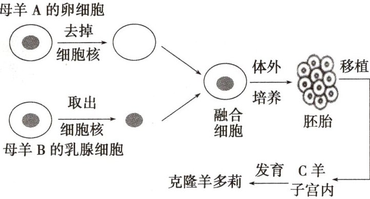 【解析】 细胞核内含有遗传物质,能够传递遗传信息,所以,培育出的多莉的外貌最像母羊 B,A 正确;通过分析可知,多莉的诞生说明控制生物遗传和发育的物质主要位于细胞核内,B 正确;多莉是由融合细胞发育成的,培育过程中没有受精卵,C 错误;多莉的遗传物质来自母羊 B,所以多莉是一只母羊,D 正确。
