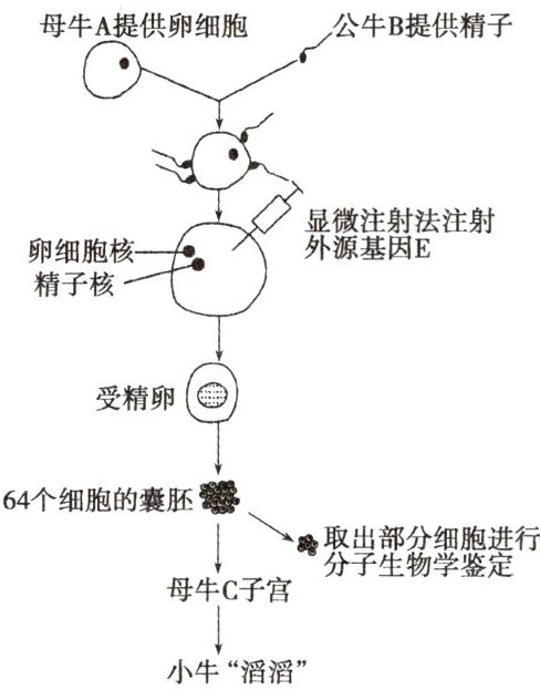 (1)遗传物质存在于细胞核中,外源基因也属于遗传物质,因此小牛“滔滔”细胞核中的遗传物质来自于母牛 A 的卵细胞核、公牛 B 的精子核和外源基因 E。