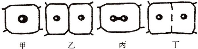 [解析] 细胞核一分为二,然后细胞质分成 2 份,每份含有一个细胞核,然后在细胞的中央形成新的细胞壁和新的细胞膜,最后一个细胞分为 2 个新细胞。图示中甲为分裂前的细胞,乙已经由一个细胞变成了 2 个细胞,丙表示细胞核一分为二的过程,丁表示在细胞中的中央形成新的细胞壁,所以分裂顺序应该是:甲→丙→丁→乙。