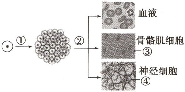 【解析】 图中①只是细胞数目的增多,表示细胞分裂的过程,A正确;②形成不同组织,表示细胞分化的过程,B正确;细胞核分裂时,染色体的变化是明显。染色体的数量在细胞分裂时已经加倍,在细胞分裂过程中,染色体分成完全相同的两份,分别进入两个新细胞中。也就是说,两个新细胞的染色体形态和数目相同。因此新细胞和原细胞所含有的遗传物质是一样的,C正确、D错误。
