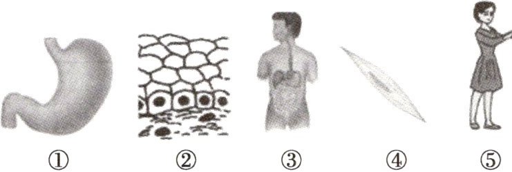【解析】 人体的结构层次从小到大依次是细胞→组织→器官→系统→人体。图中的①是胃,属于器官;②是上皮组织,属于组织;③表示的是人体的消化系统,属于系统;④是肌肉细胞,属于细胞,⑤是完整的人体。因此按照构成人体的结构层次排列,正确的顺序应该是④→②→①→③→⑤。可见ABC错误,D正确。