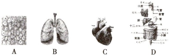 【解析】 A属于组织、B是肺属于器官,C是心脏属于器官,D是消化系统。