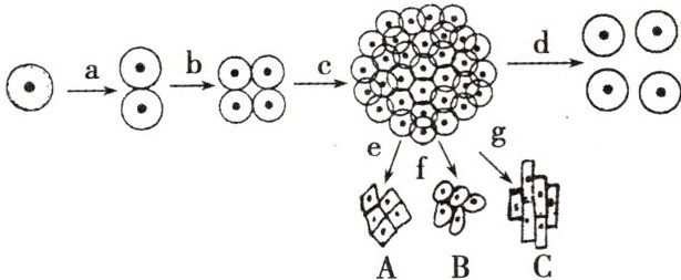 (2) e、f、g形成的组织A、B、C中,仍具有分裂能力的是____,失去分裂能力的是____。