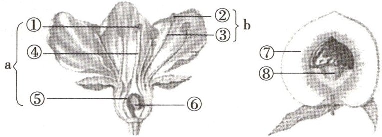 【解析】 b雄蕊由②花药和③花丝组成,②花药内有花粉,每个花粉里有两个精子,A正确;花的主要结构是雌蕊和雄蕊,与果实和种子的形成有密切关系,桃花中同时具有雌蕊和雄蕊属于两性花,B正确;一朵完整的花,经过传粉、受精后,只有子房才继续发育,子房发育成果实,子房壁发育成果皮,子房中的胚珠发育成种子,受精卵发育成胚。图中的⑦果肉属于果皮,由子房壁发育而来,C错误;桃花受精时,花粉落到雌蕊柱头上后受到柱头黏液的刺激萌发出花粉管,花粉管里有两个精子,花粉管沿柱头到达胚珠后,花粉管顶端破裂,两个精子释放出来,一个精子与两个极核融合形成受精极核,发育成胚乳;另一个精子与卵细胞相融合形成受精卵,发育成胚,因此,桃树的受精方式为双受精,D正确。