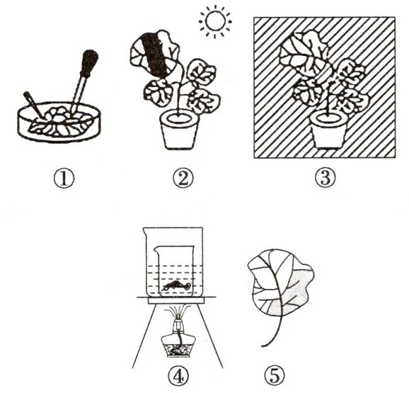 【解析】 在本实验中,遮光区域和未遮光区域构成的唯一的不同条件是光。因此,本实验的目的之一是探究光照是光合作用的必要条件,A正确;该实验正确的操作顺序是:③暗处理,②叶片遮光处理,④叶片酒精脱色,①碘液染色,⑤观察实验现象,B错误;把叶片放入盛有酒精的小烧杯中,隔水加热,使叶片含有的叶绿素溶解到酒精中至叶片变成黄白色,便于观察到淀粉遇碘变蓝的颜色反应。所以,④为隔水加热,叶绿素溶解于小烧杯中的酒精里,C正确;⑤叶片未遮光部分进行光合作用制造淀粉,滴加碘液变蓝色,而叶片遮光部分缺少光照未进行光合作用制造淀粉,滴加碘液不变蓝色,所以⑤的颜色变化证明了光合作用产生淀粉,D正确。
