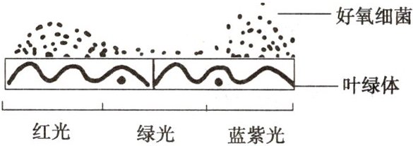【解析】 好氧细菌有氧才能生存,图中有好氧细菌,因此表明光合作用释放氧气,A正确;图中表明光合作用释放氧气,而不能表明光合作用吸收二氧化碳,B错误;绿光处好氧细菌少,表明绿光处氧气少,因此绿光不利于进行光合作用,C正确;光照不同处好氧细菌的多少不同,表明光照不同产生的氧气不同,因此光照不同,光合作用强弱不同,D正确;因此该实验不能得出的结论是光合作用吸收二氧化碳。