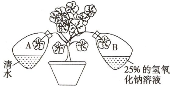 17. 将天竺葵放在暗处48h后,选取两片大小相近、生长健壮的叶片A和B,按照下图连好装置(锥形瓶用软木塞和棉花封口密闭,氢氧化钠溶液用干吸收二氧化碳),移到光下2-3h,然后取下叶片A和B,脱色处理后,用碘液检验,下列相关叙述,错误的是( )