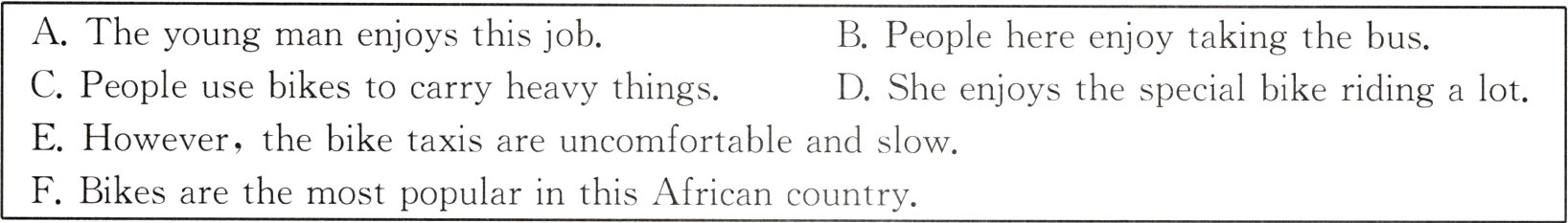 Alice is a 21 - year - old student from Canada. 3. ________ “I really like the bike taxi,” she says. “It's easy and cheap.” Alice usually pays just 1 for going shopping in town. 28 - year - old Panjira Khombe began to ride a bike taxi two years ago. 4. ________ “I used to make boats for a living, but that's a hard job. Being a bike taxi rider is easy for me and I don't mind(介意)carrying heavy people,” he says.