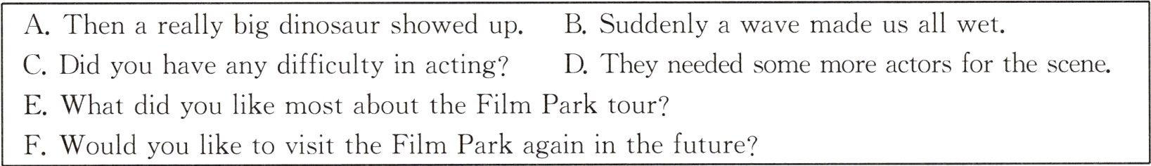 Roddy:No,we didn't,but we did visit a film set after the tour. The crew(工作人员)were filming a scene(镜头)showing some students in a school. 3.____________ To cut a long story short,the director(导演)chose me to appear in the film.