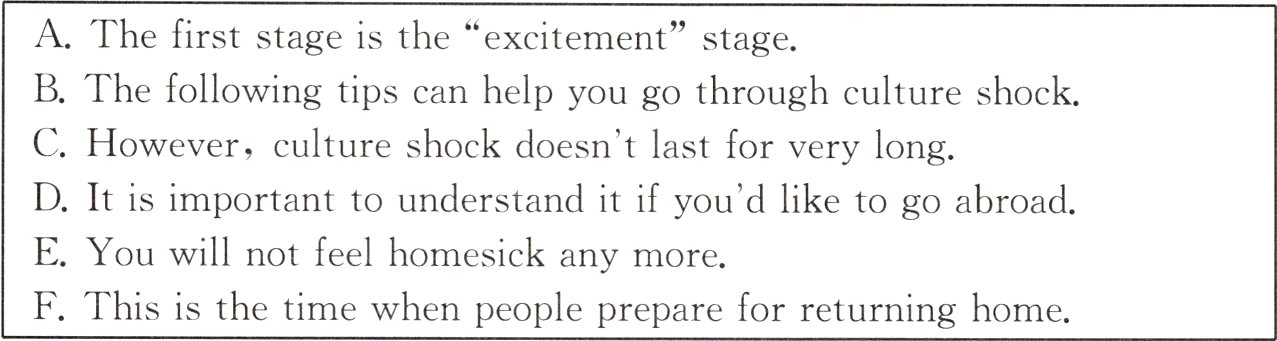 Most people who move to a foreign country may have a period of time when they feel very homesick (思乡的) and have a lot of stress (压力). This feeling is often called “culture shock”. 1.________