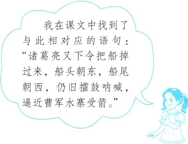 我在课文中找到了与此相对应的语句:“诸葛亮又下令把船掉过来,船头朝东,船尾朝西,仍旧擂鼓呐喊,逼近曹军水寨受箭。”