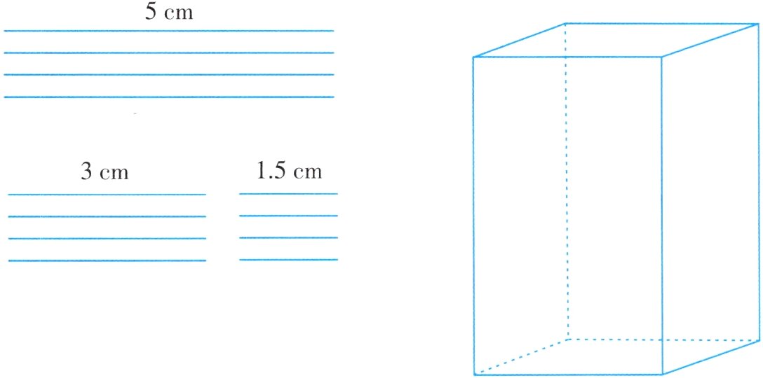 下面的12根小棒能搭成怎样的一个长方体?请你在下方右图中标注出相应的数据,并计算它的体积