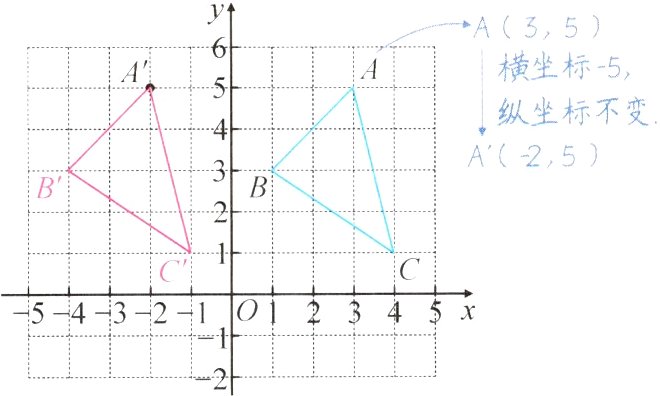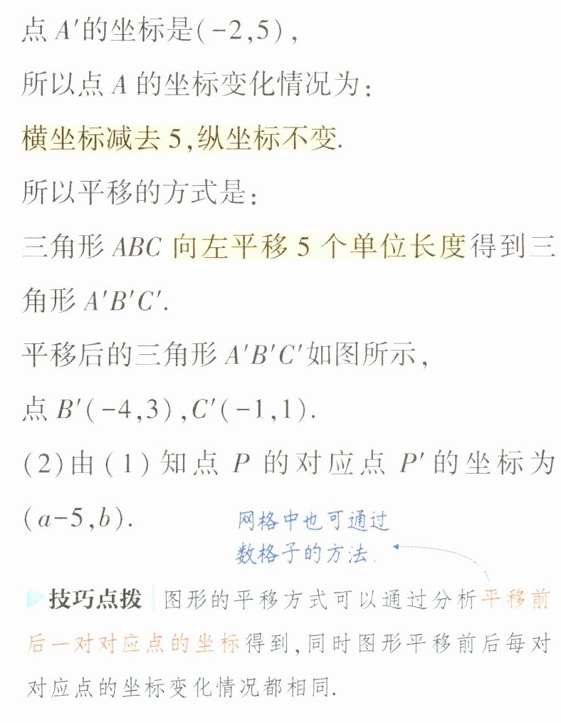 例4 在平面直角坐标系中,三角形ABC的三个顶点的位置如图所示,点A'的坐标是(-2,5),现将三角形ABC平移,使点A变为点A',点B,C分别变为点B',C'.