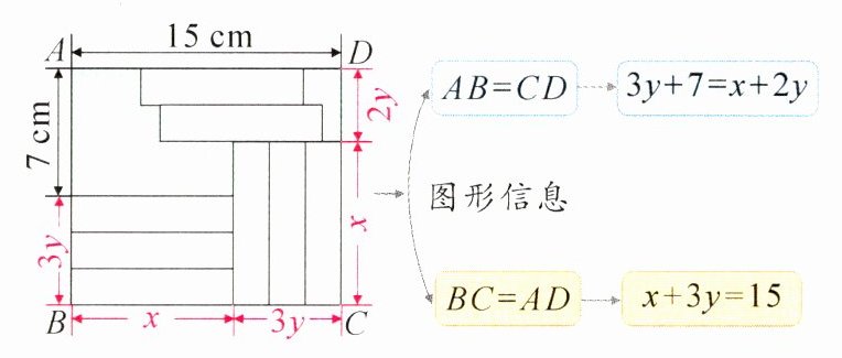 解:根据题意,得$\begin{cases}3y + 7 = x + 2y,\\x + 3y = 15.\end{cases}$解得$\begin{cases}x = 9,\\y = 2.\end{cases}$
