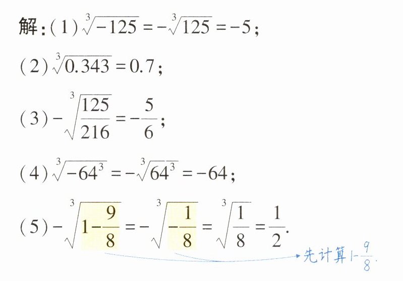 (1)$\sqrt[3]{-125}$;(2)$\sqrt[3]{0.343}$;(3)$-\sqrt[3]{\frac{125}{216}}$;(4)$\sqrt[3]{-64^{3}}$;(5)$-\sqrt[3]{1 - \frac{9}{8}}$。