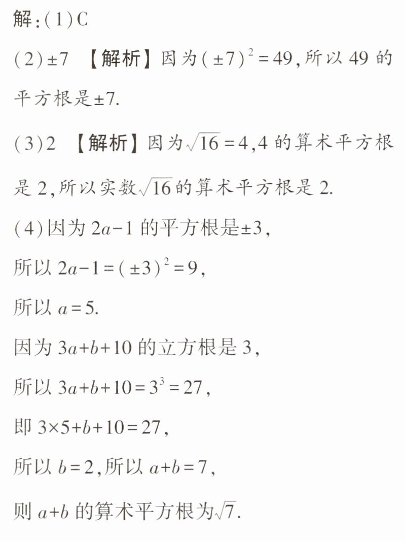 (4)已知2a-1的平方根是±3,3a+b+10的立方根是3,求a+b的算术平方根.