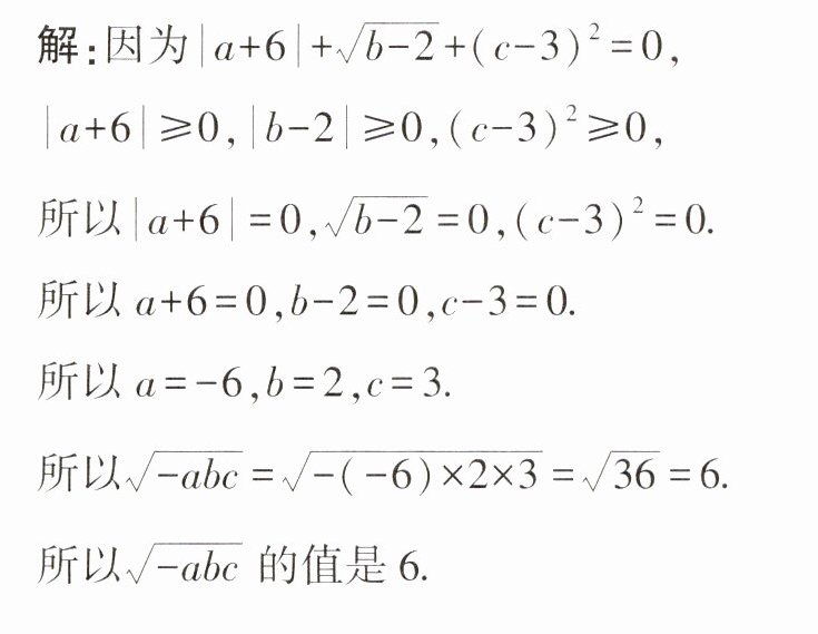 例2 已知实数a,b,c满足|a+6|+√b-2+(c-3)²=0,求√-abc的值.