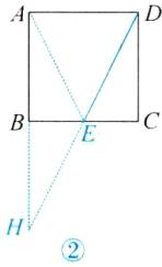 ∴ $BF + DE$ 的最小值等于 $AE + DE$ 的最小值。如图②,作点A关于BC的对称点H,连接DH,DH与BC的交点即为所求的点E。连接AE,根据对称性可知 $AE = HE$,
