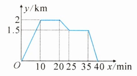 例2 [教材P76例2变式题]已知小明家、活动中心、书店在同一条直线上.小明从家出发跑步去活动中心,在活动中心活动了一段时间,然后步行返回到书店,在书店看书停留了一段时间,最后骑自行车回家.如图是小明离家的距离y(单位:km)与时间x(单位:min)之间的对应关系.根据相关信息,下列判断正确的是( )
