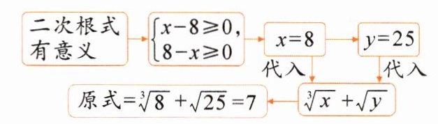 例3 ★★☆ 已知$x$,$y$为实数,且$y = \sqrt{x - 8}-\sqrt{8 - x}+25$,则$\sqrt[3]{x}+\sqrt{y}$的值为______。