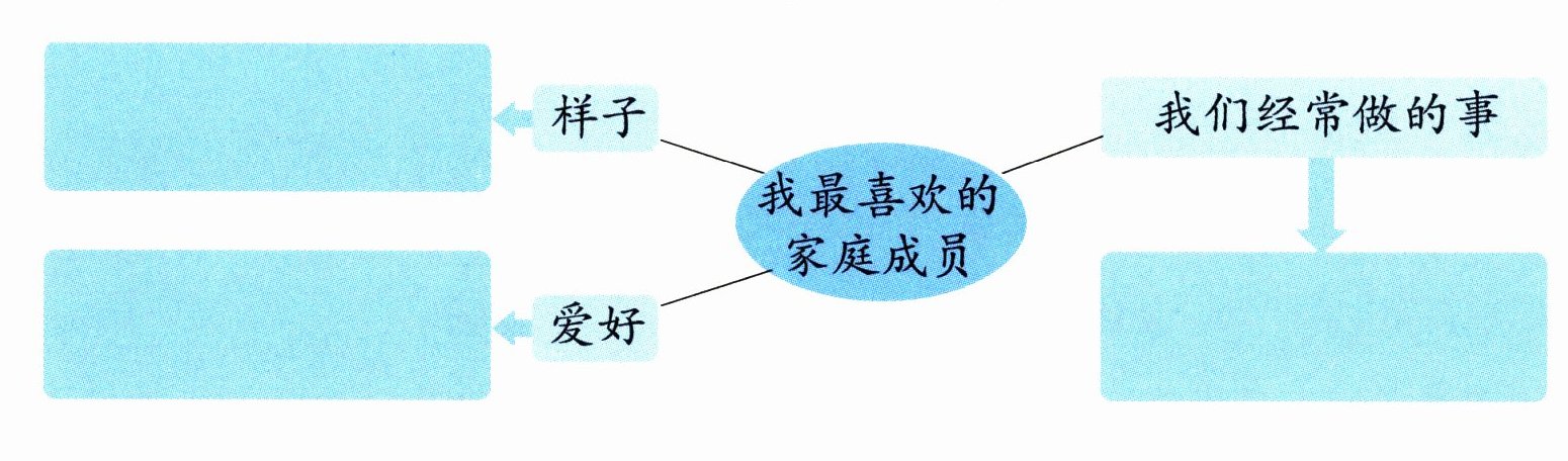 每个人都有一个温暖的家,你最喜欢家里的哪一位成员?先填一填思维导图,再写几句话,把他介绍给同学们。